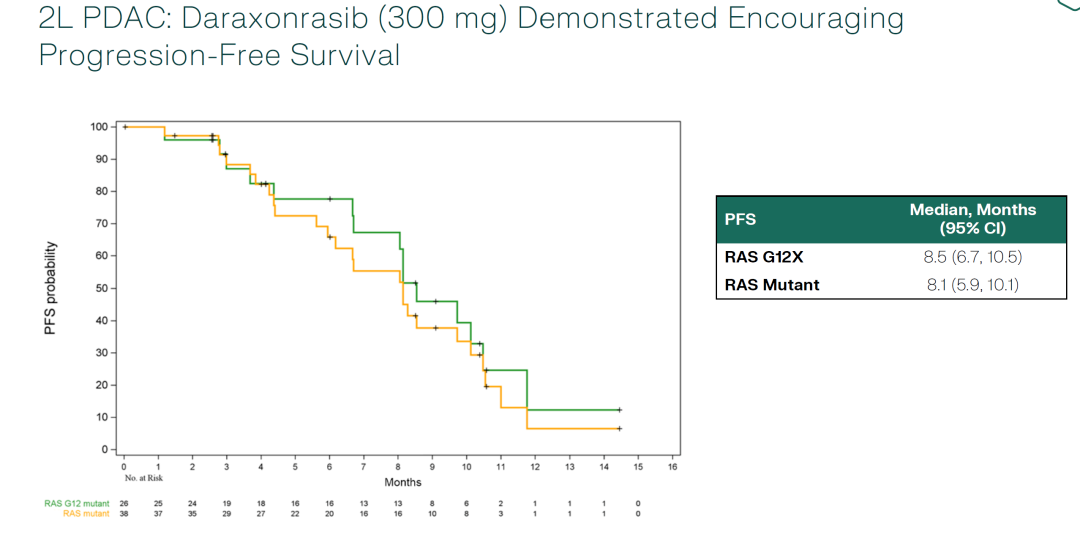 其次,在疗效方面:daraxonrasib 300毫克每日一次(QD)的治疗剂量在二线(2L)RAS突变PDAC患者中显示出令人信服的抗肿瘤活性和持久性。