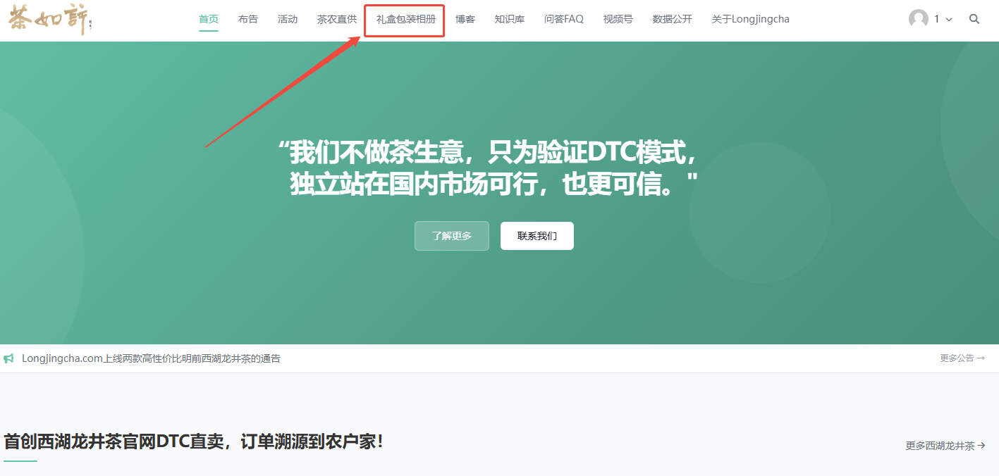 Longjingcha.com 官网的顶部导航栏上线了一个新版块——礼盒包装相册。