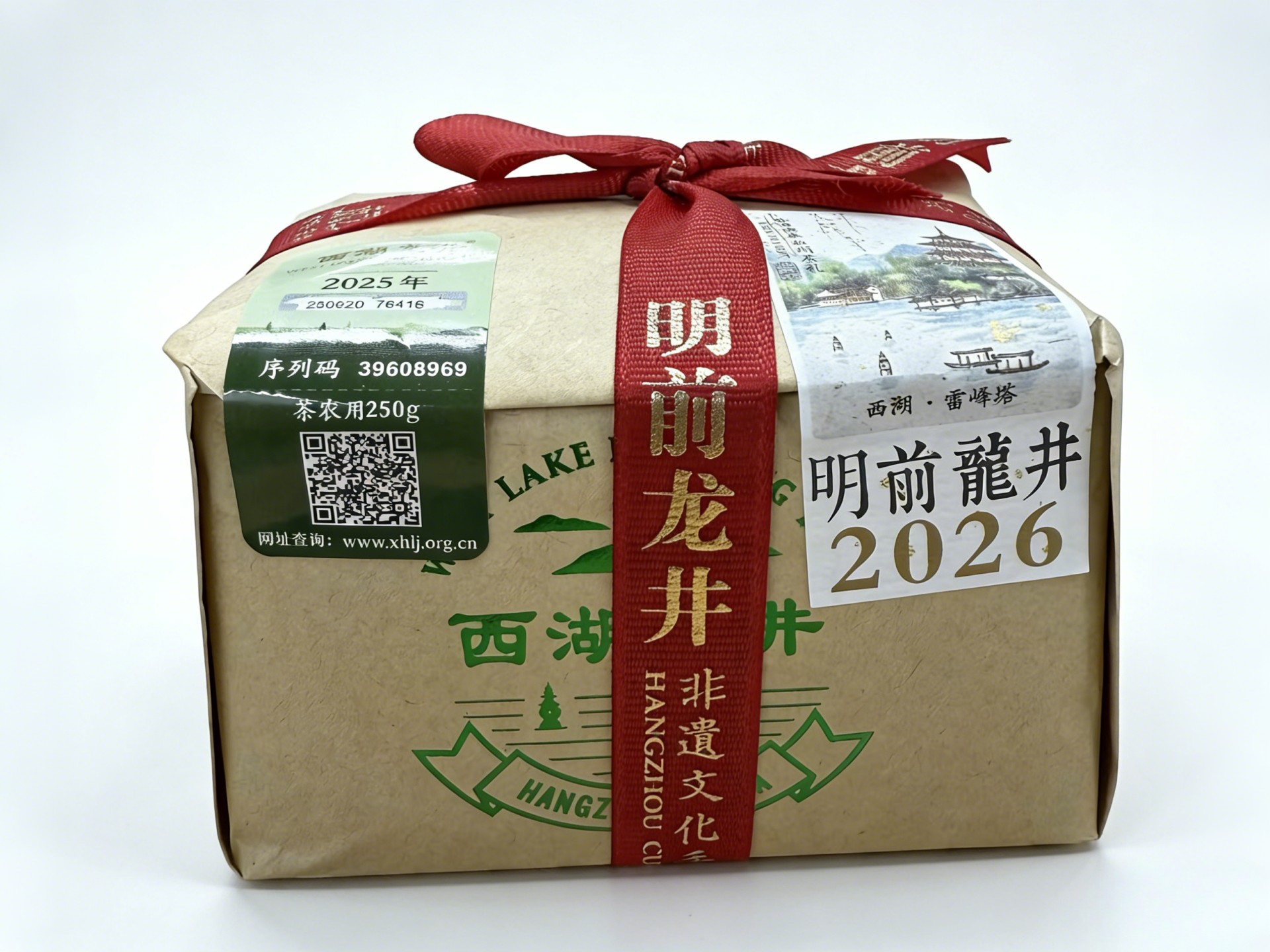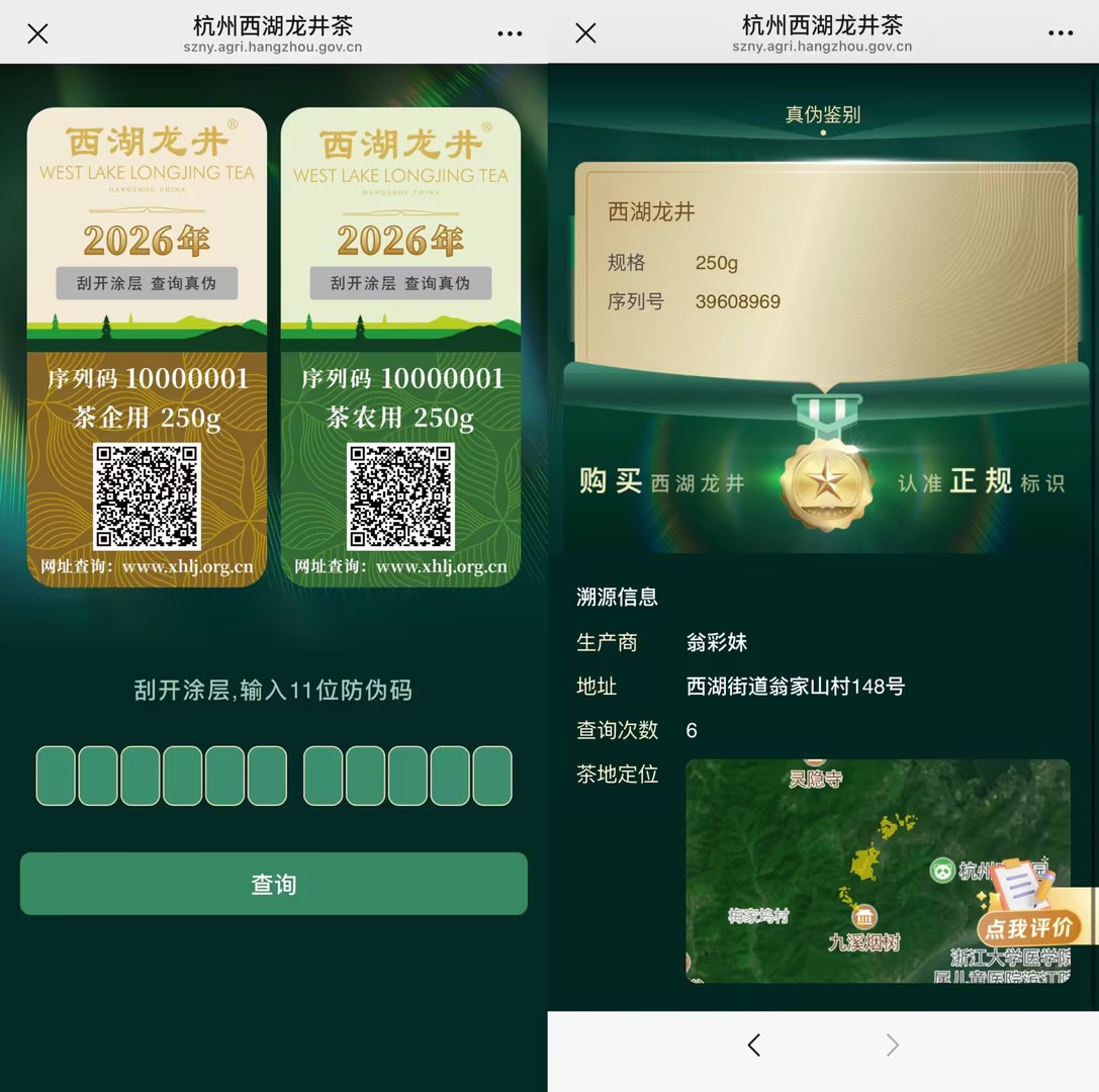 无论选择哪一款包装,每一份茶都会严格配备对应的官方西湖龙井茶农标。当您收到茶叶,只需手机扫一扫标签上的二维码,刮开涂层并填入11位防伪码,这罐茶出自西湖核心产区哪一户茶农之手、采摘信息如何。订单直接溯源农户,只为让您喝得踏实。