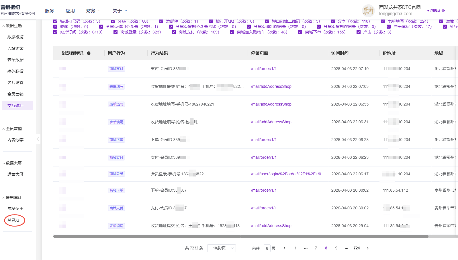因为营销枢纽搭建的数智化官网,能清晰的记录每一位访客入站后的行为动作,在接入AI能力后,可以对访客的“行为、举止”进行精准的分析。