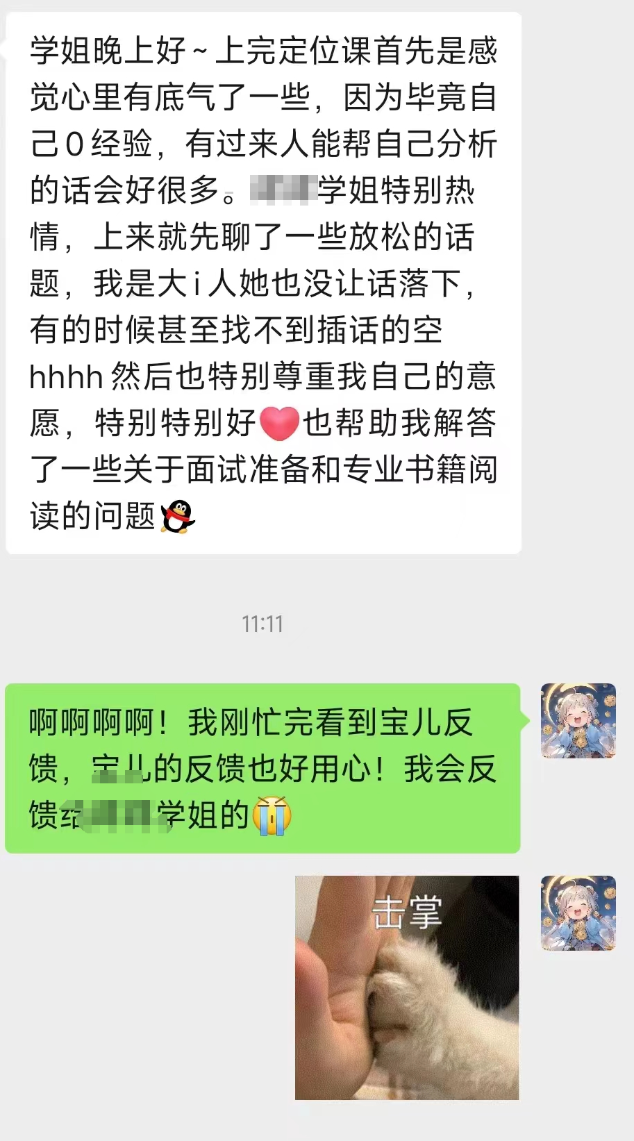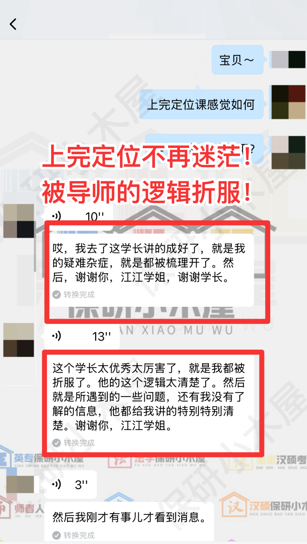 定位课不是单方面输出的过程,而是上岸学长学姐“传承经验,传递信心”,以及与学弟学妹双向奔赴的过程,你可以在课上随时提出你的问题,和导师进行1v1交流和专属答疑~
