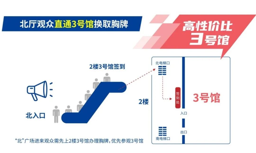 为方便观众快速入场,展会设置北厅专用通道。从北广场进场的观众,请先上2楼3号馆办理胸牌,即可优先参观3号馆。