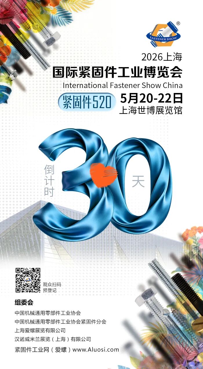 由中国机械通用零部件工业协会、中国机械通用零部件工业协会紧固件分会、上海爱螺展览有限公司、汉诺威米兰展览(上海)有限公司联合主办的“2026上海国际紧固件工业博览会”,正式进入倒计时30天!