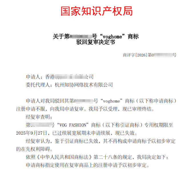 知协捷报|香港一公司申请“voghome”商标驳回复审成功