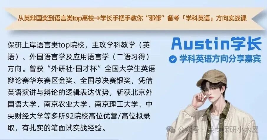 为了让大家吃透学科英语方向的招录逻辑与备考策略,小木屋特邀保研至顶尖语言类院校、拥有丰富实战辅导经验的Austin学长,带来一场干货满满的公益讲座,手把手教你备考学科英语方向实战课,一站式破除你的信息差与焦虑!🤩