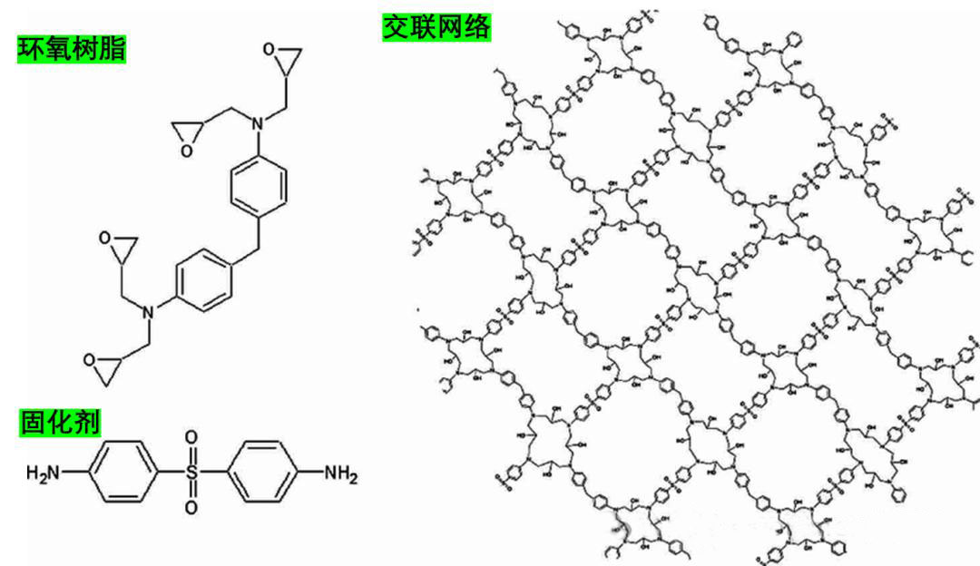 环氧就完全不同。固化后的环氧树脂是一个高交联密度的三维网状结构,
