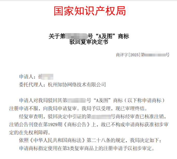 在商标申请实践中,因与在先注册的商标构成近似而被驳回是常见障碍。然而,在先权利的状态并非一成不变,当引证商标被撤销,申请商标就有注册的机会。一起来看,知协近期成功代理的“A及图”商标驳回复审案件。