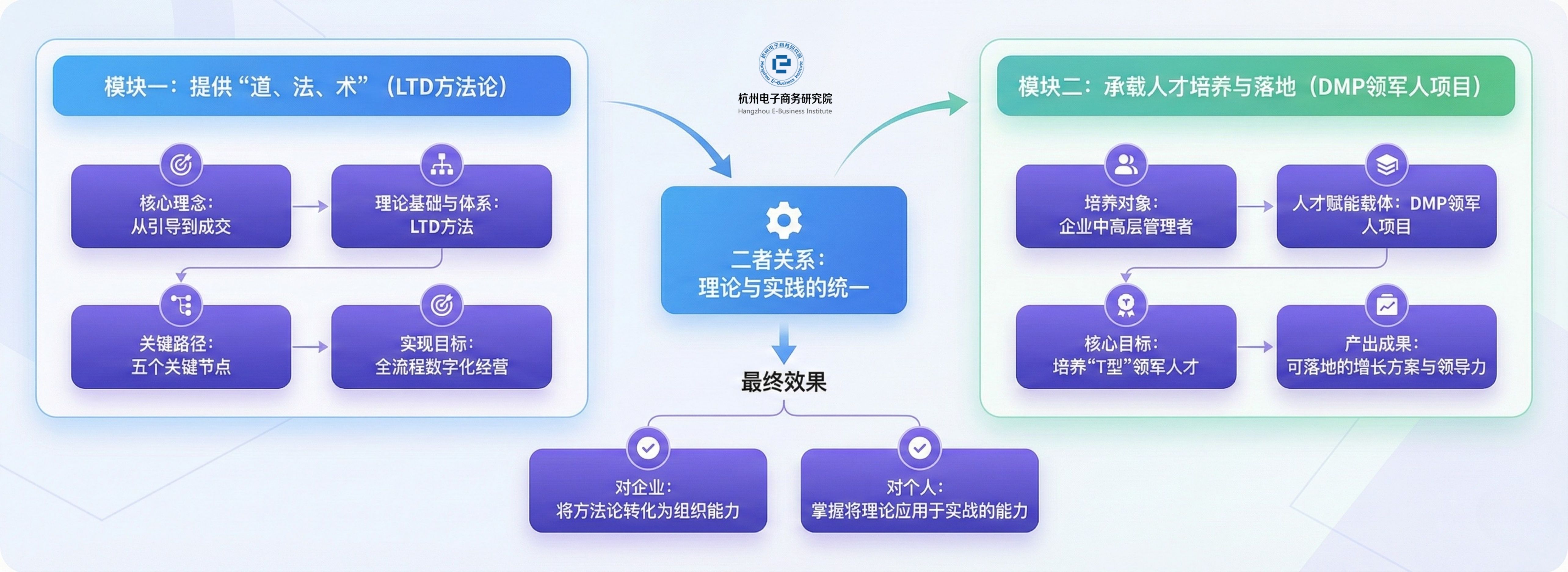 杭州电子商务研究院、杭州市市场营销协会等通过“浙商数智学堂”等活动推广LTD理念,吸引和筛选出有深度转型需求的企业家和高管,他们正是DMP项目的目标学员。而浙江工业大学EDP中心等高校DMP项目毕业的学员,又会成为LTD方法论的实践者和代言人,形成从理论传播到人才培养,再到实践反馈的完整生态闭环。