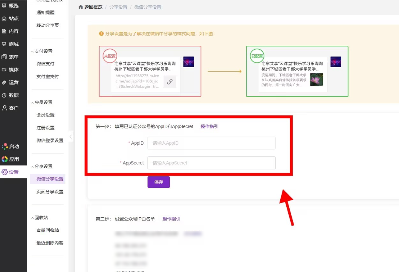 然后,我们登入到longjingcha.com营销枢纽后台,在站点设置里找到微信分享设置,对应输入AppID、AppSecret等信息。